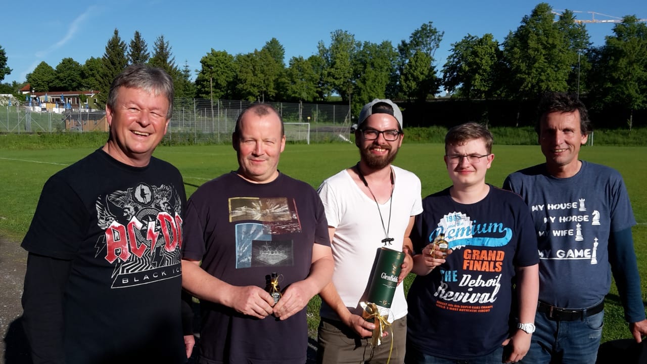 Siegerehrung; von links nach rechts: Wolfgang Max Schmitt (Organisator), dritter Platz Helmut Pfalzer PSV Memmingen, Sieger Alexander Billing SC Schwabmünchen, zweiter Platz Timo Helm SC Bad Königshofen, Vladimir Stepanek (Abteilungsleiter ASV Martinszell)