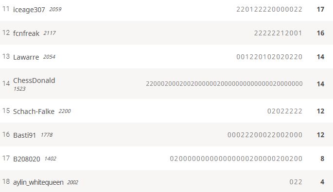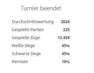 Insgesamt nahmen 16 Spieler und Spielerinnen am Turnier teil, bei dem insgesamt 225 Partien mit 13.458 Zügen, in sieben Stunden gespielt wurden.